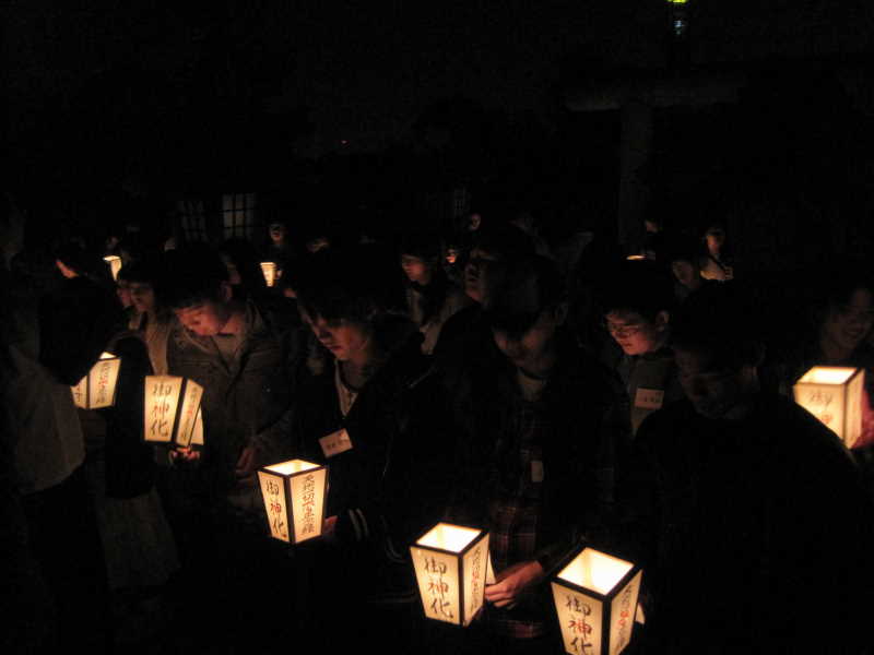 懇親会の前に、みんなで灯龍を持って、捨身の松神社でお祈りをしました。
